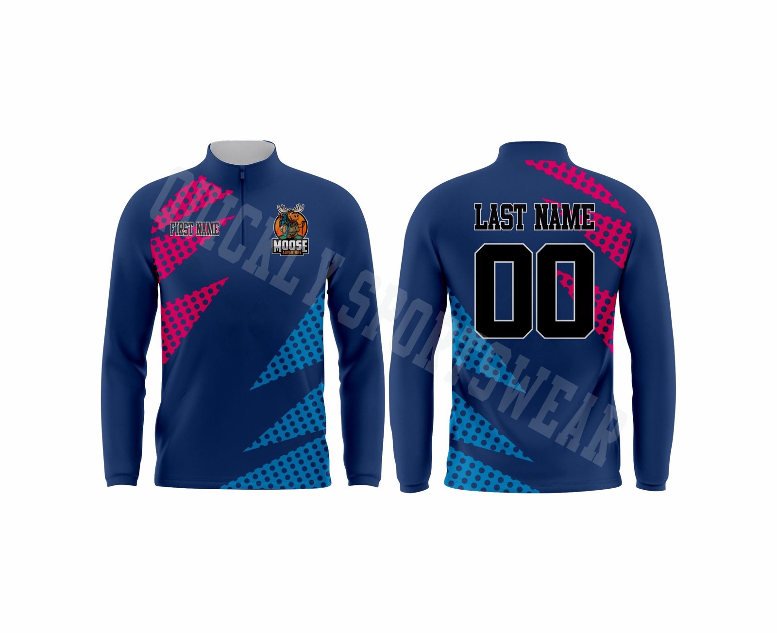 Custom sublimated long sleeve 1/4 zip pullover jersey. With 100% polyester dry-fit fabric