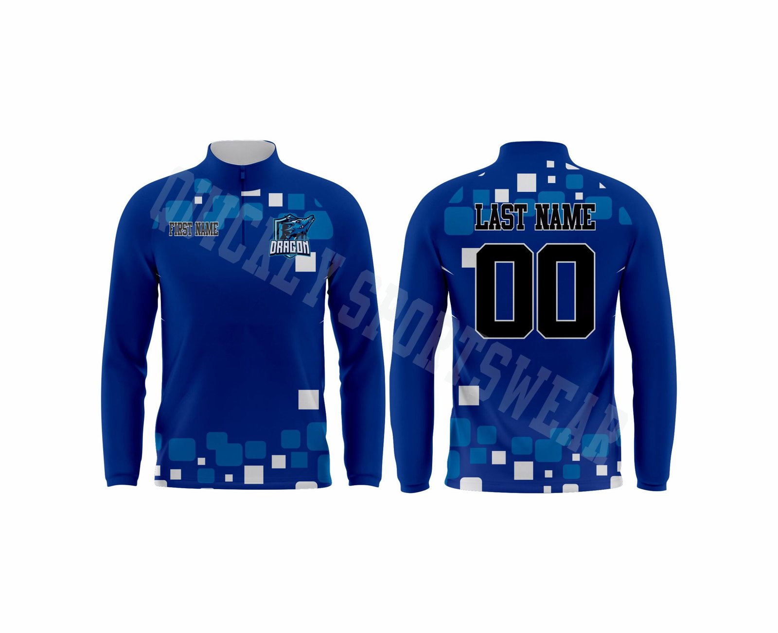 Custom sublimated long sleeve 1/4 zip pullover jersey. With 100% polyester dry-fit fabric