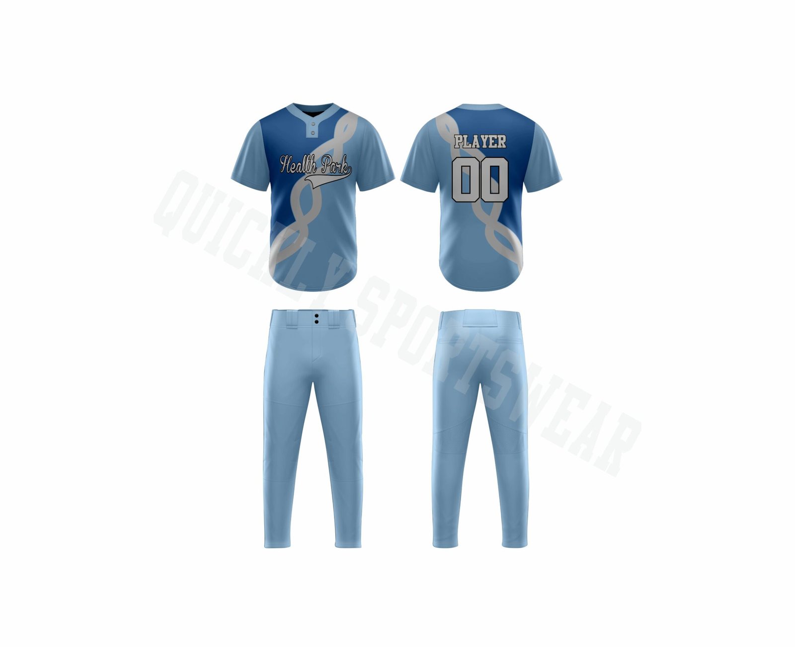 Custom sublimated two button baseball uniform. With 100% polyester dry-fit fabric