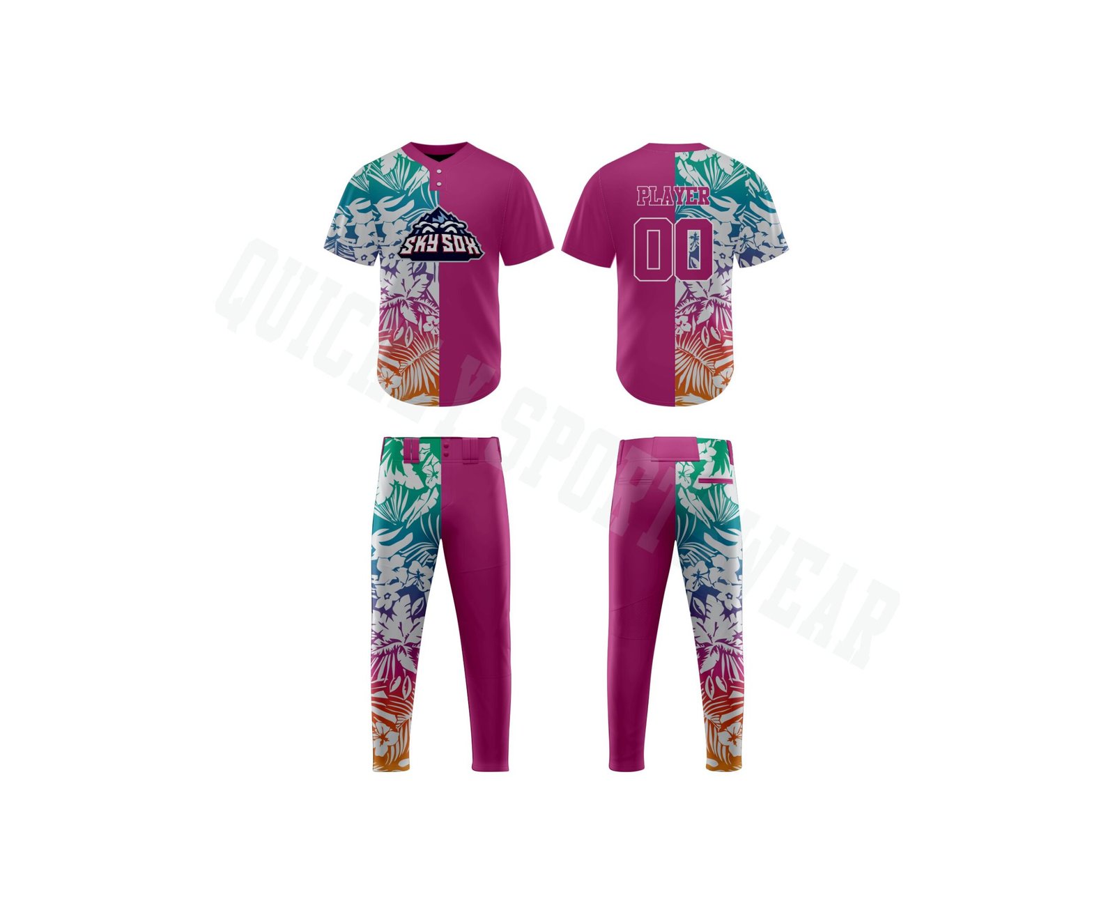 Custom sublimated two button softball uniform. With 100% polyester dry-fit fabric