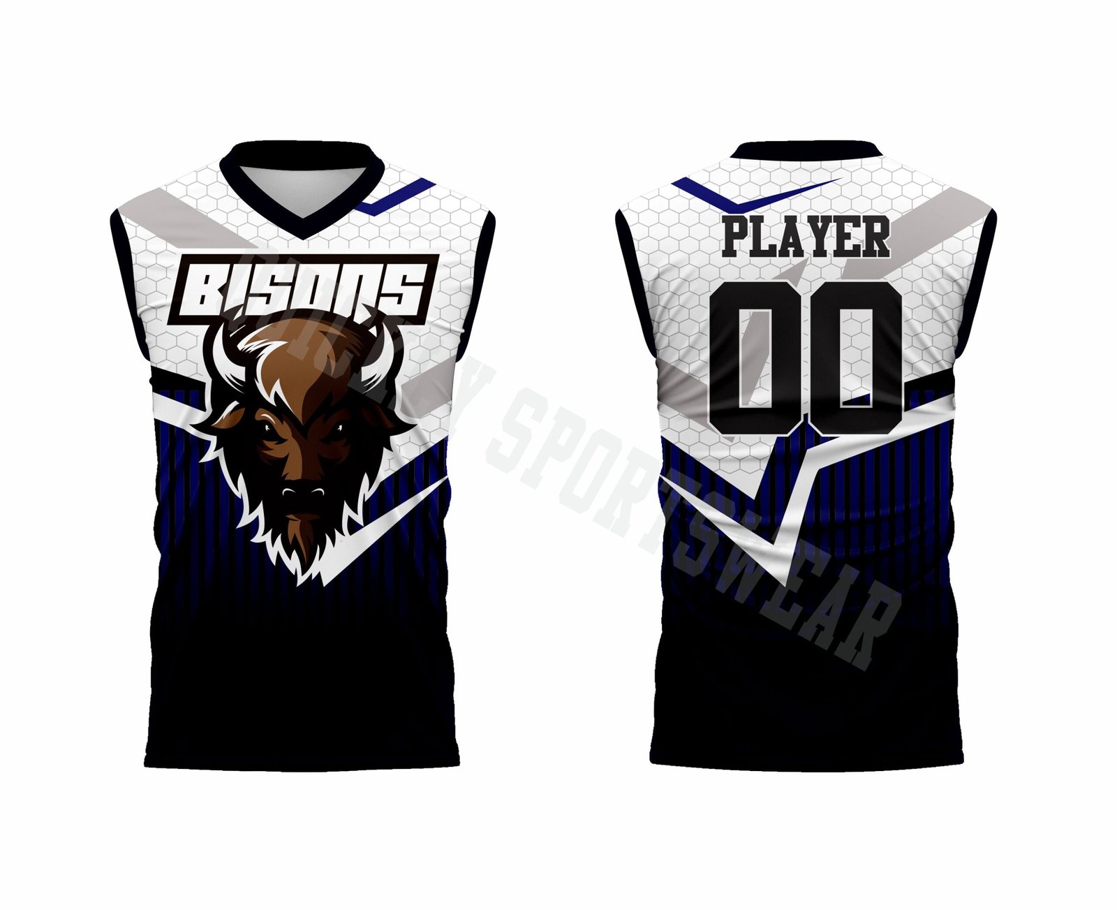 Custom sublimated V-neck sleeveless jersey. With 100% polyester dry-fit fabric